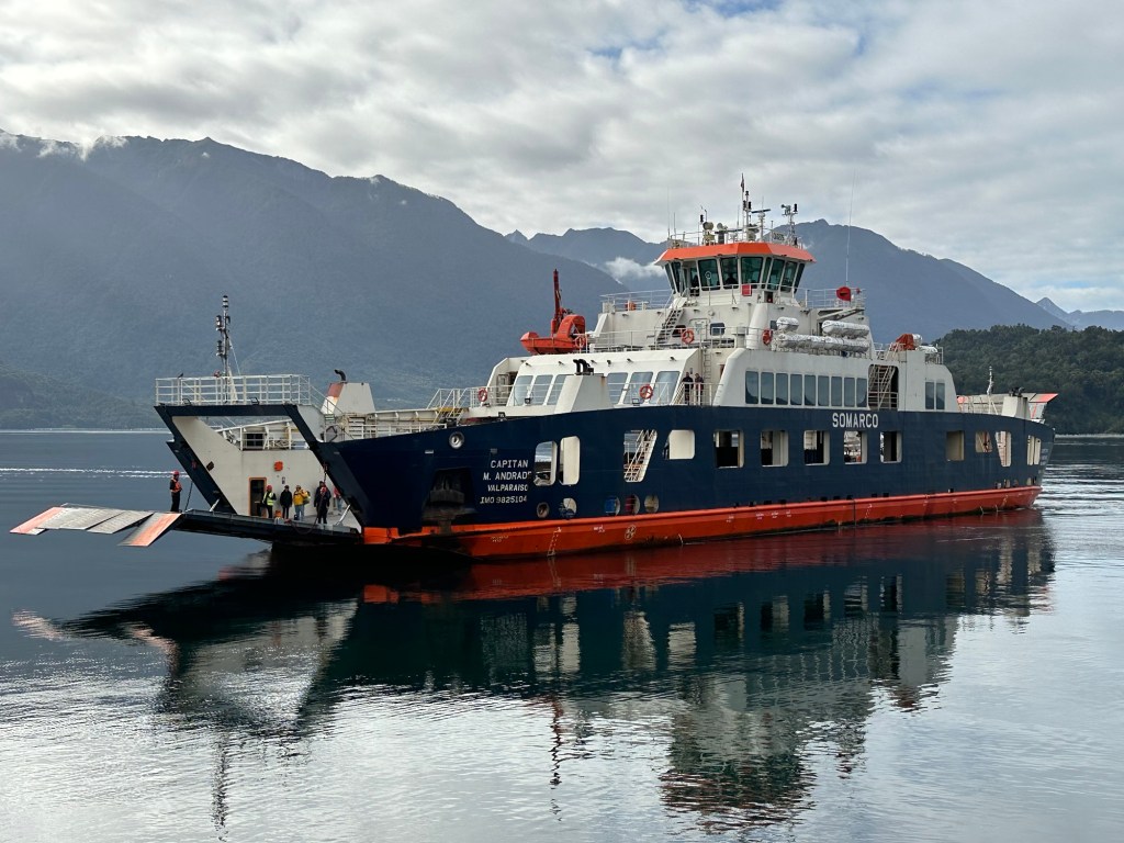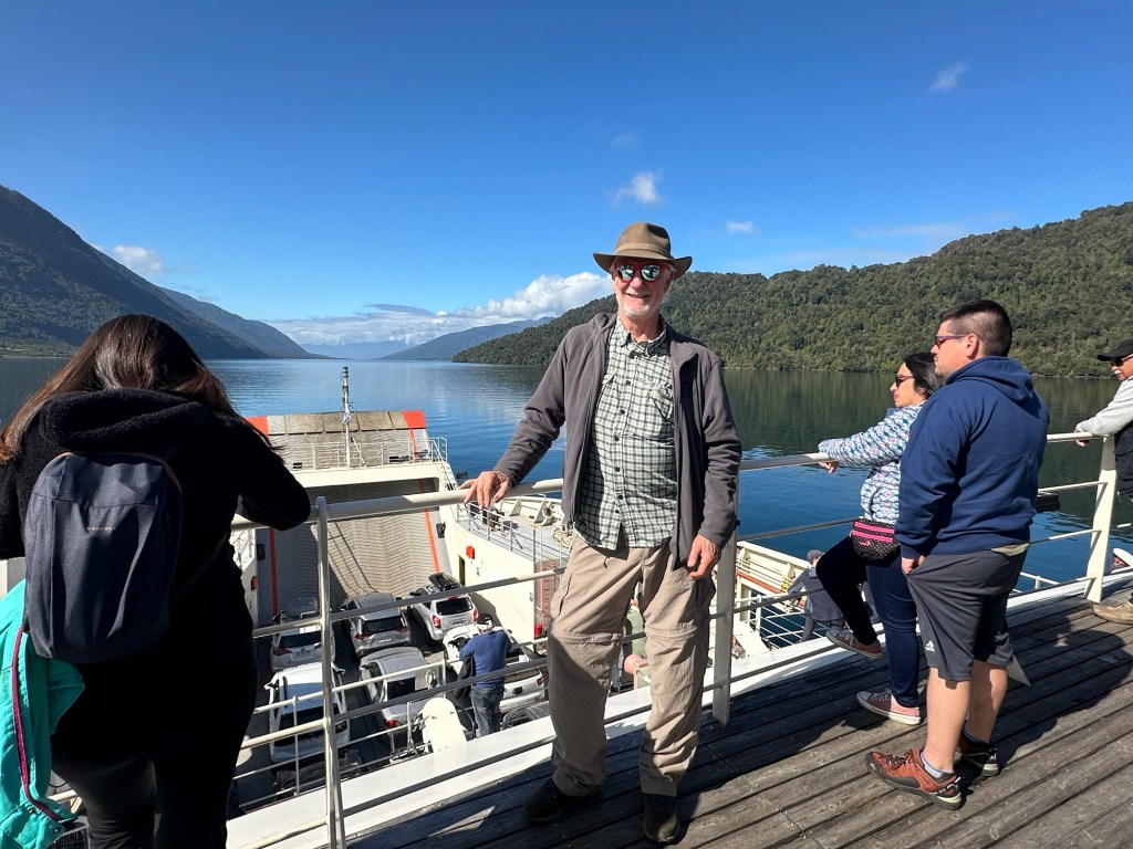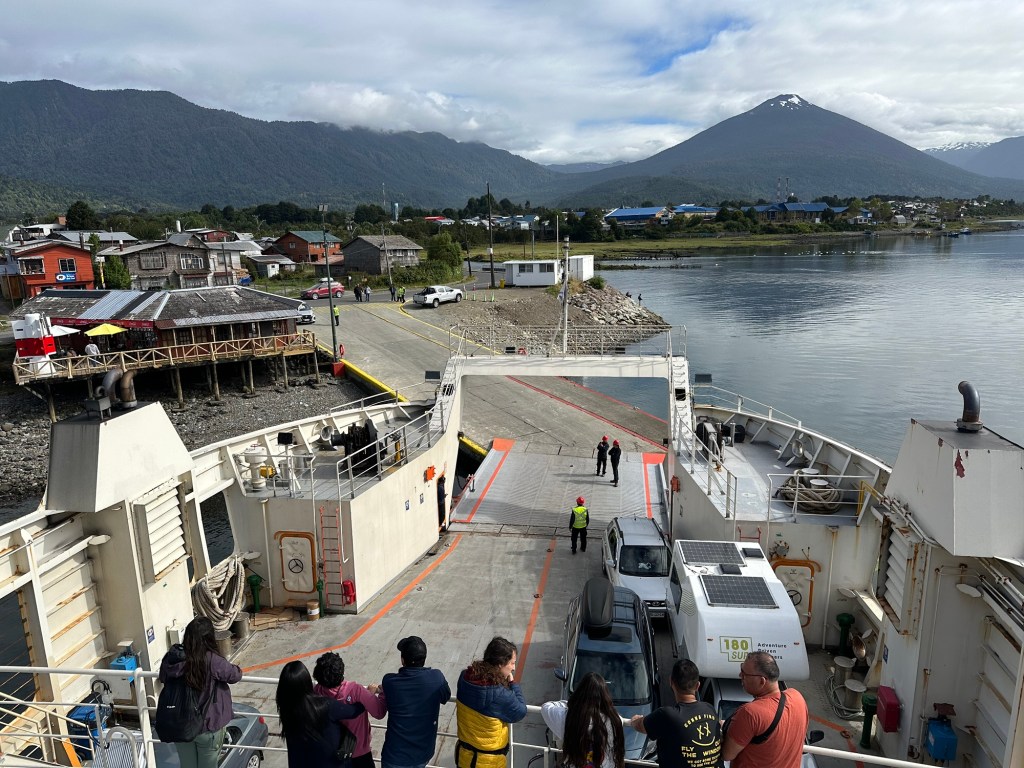 Car ferry from Hornopirén to Caleta Gonzalo. This is a crucial link in the Carretera Austral, as building a road along side this steep-walled fjord may be a near impossibility.We are all loaded (our camper on the right with the solar panels on top) and settling in for the 3 hour ferry ride. This boat holds 90 or so cars, buses, and campers.Una senorita bonita volunteered to take my picture.