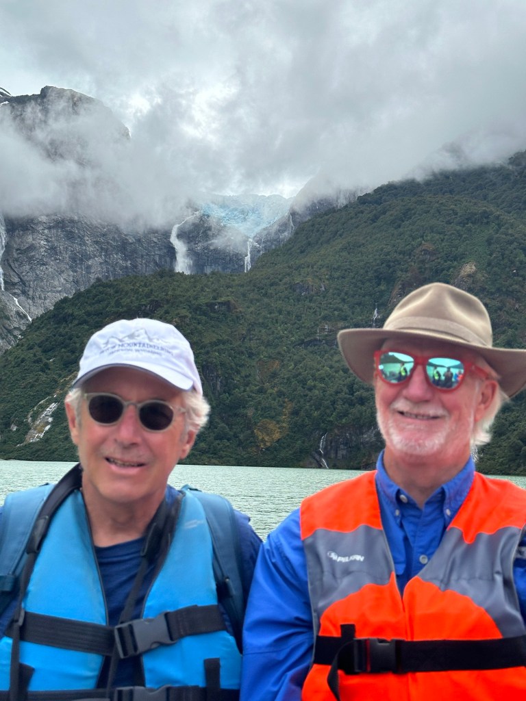 The glacier only can extend down to where the valley it occupies ends at the top of a cliff. Every so often a part of the glacier that hangs over the precipice (hey! quit pushing!) breaks off and large chunks of glacial ice fall hundreds of feet.