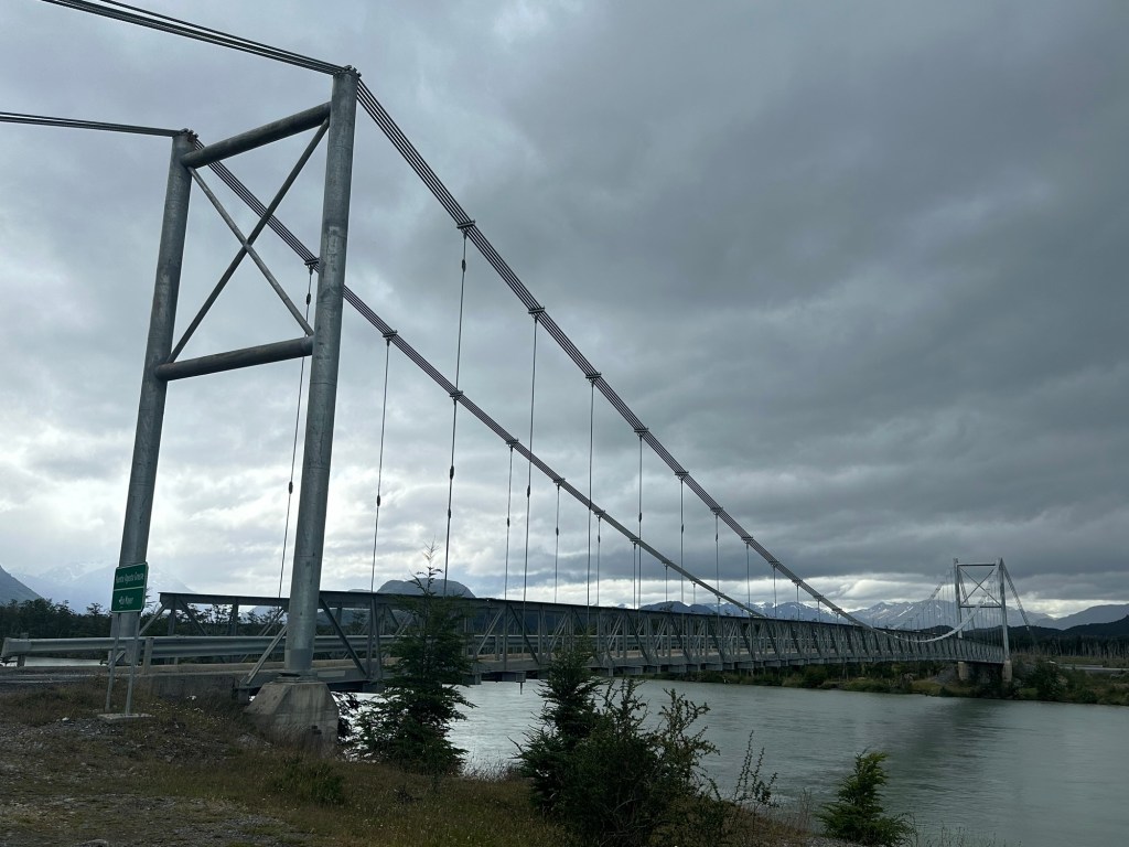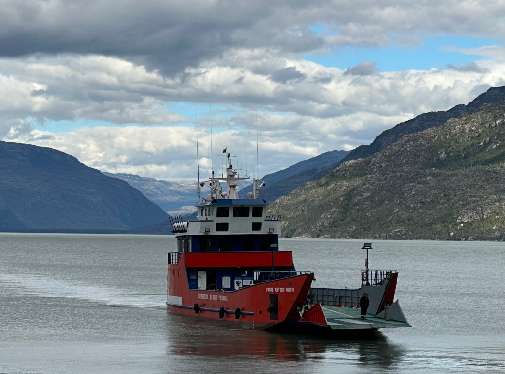 Waiting patiently for ferryThis is a free ferry provided to connect the road to Villa O’Higgins to the rest of the Carretera Austral.Loaded and heading out for an 8 km crossing to Puerto Bravo, which connects to the 100 km rough road to Villa O’Higgins.Suspension bridges everywhere in Chilean Patagonia. This is the last one on the Carretera Austral.Fin de la Carretera Austral. Yep, we made it to the end!