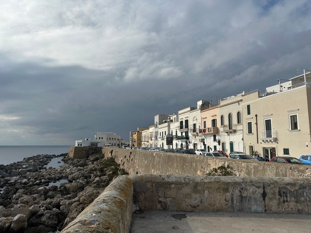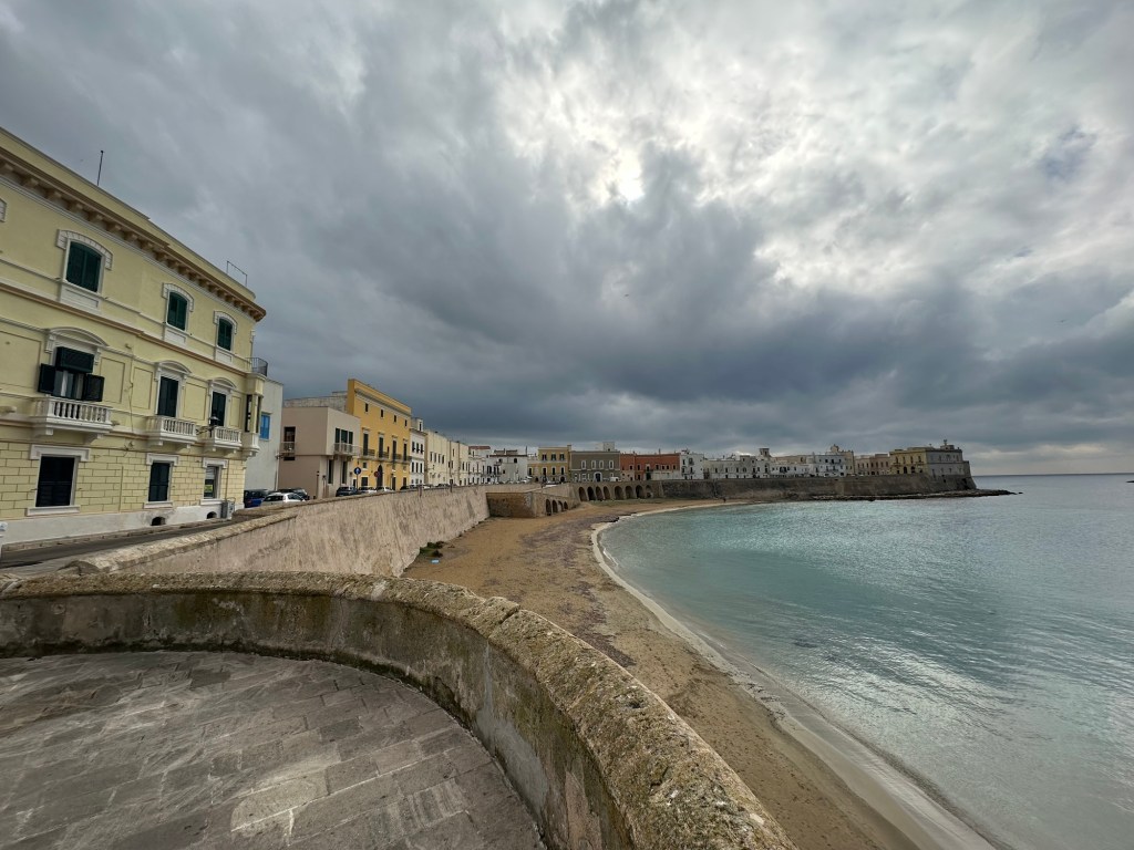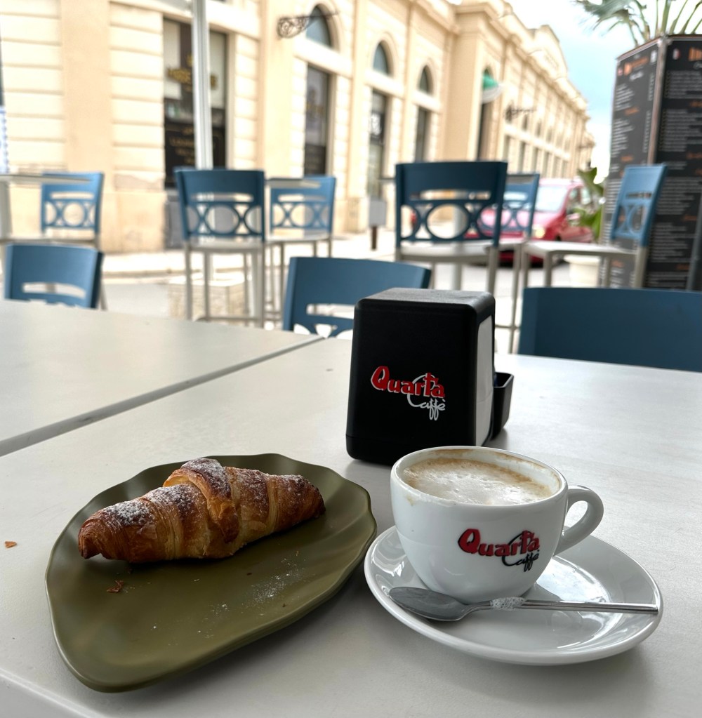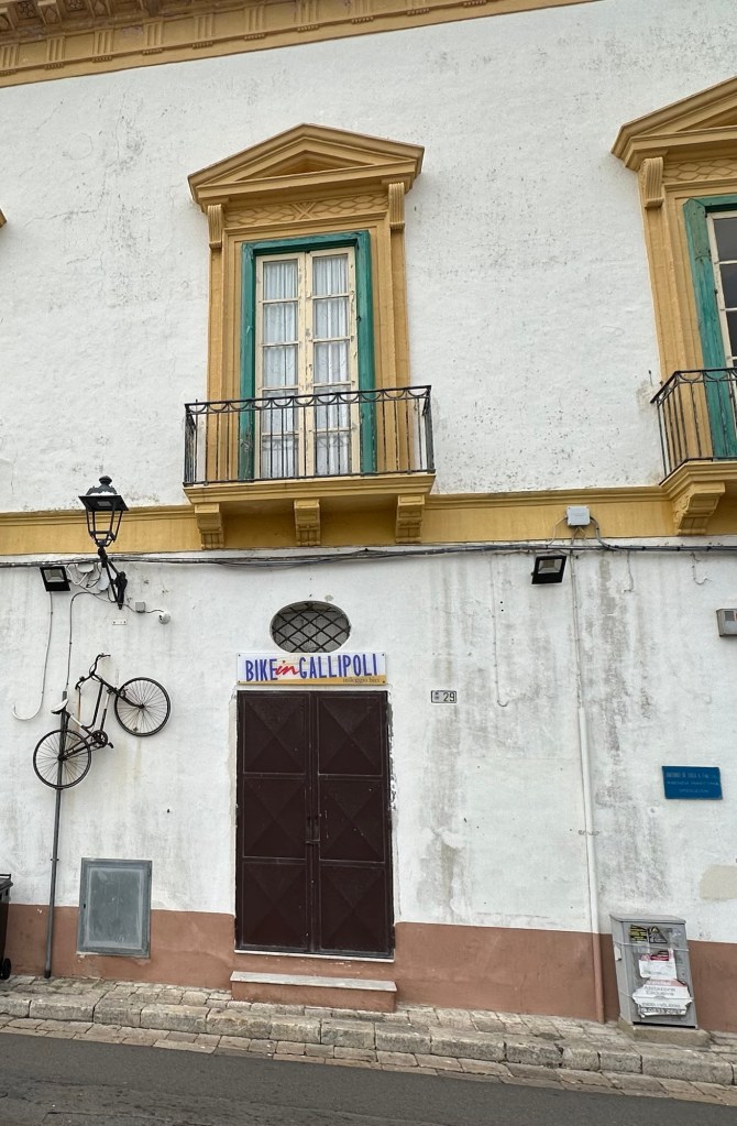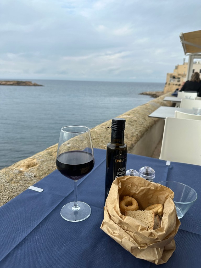I rented a car (a Lancia) in Lecce and drove to Gallipoli on the coast. No, not the one in the 1981 movie about WWI – that Gallipoli is in Turkey. Caffe e cornetto (coffee and croissant) in old Gallipoli.I didn’t rent a bike. There are some compromises being a geezer.But I did sit down for a tasty seafood salad (ensalada de frutti di mar), with bread in a bag (which is common). Oh and some nice vino rosso.Gallipoli Centro Storico (old original part of town) is on an island.