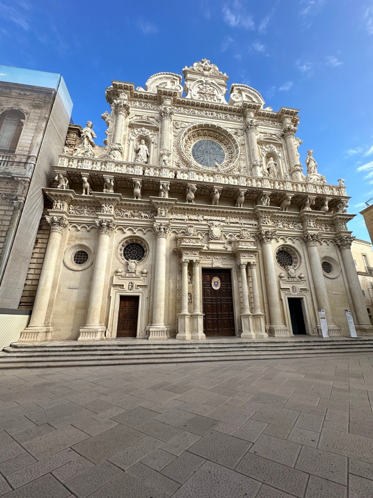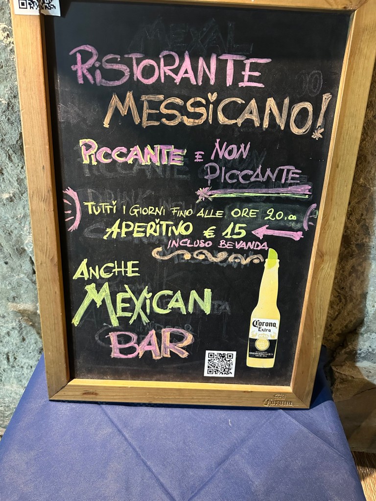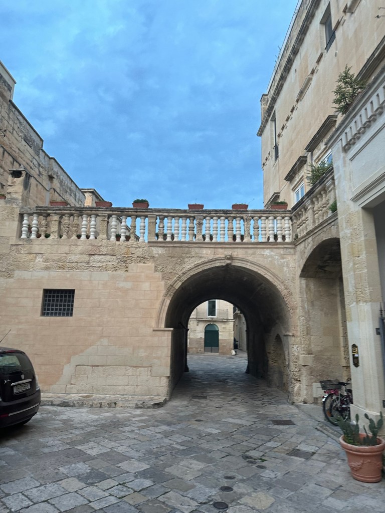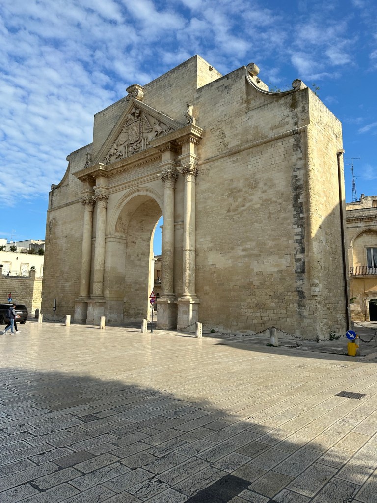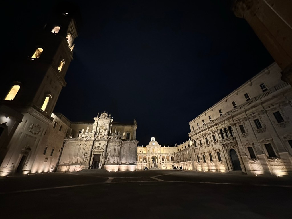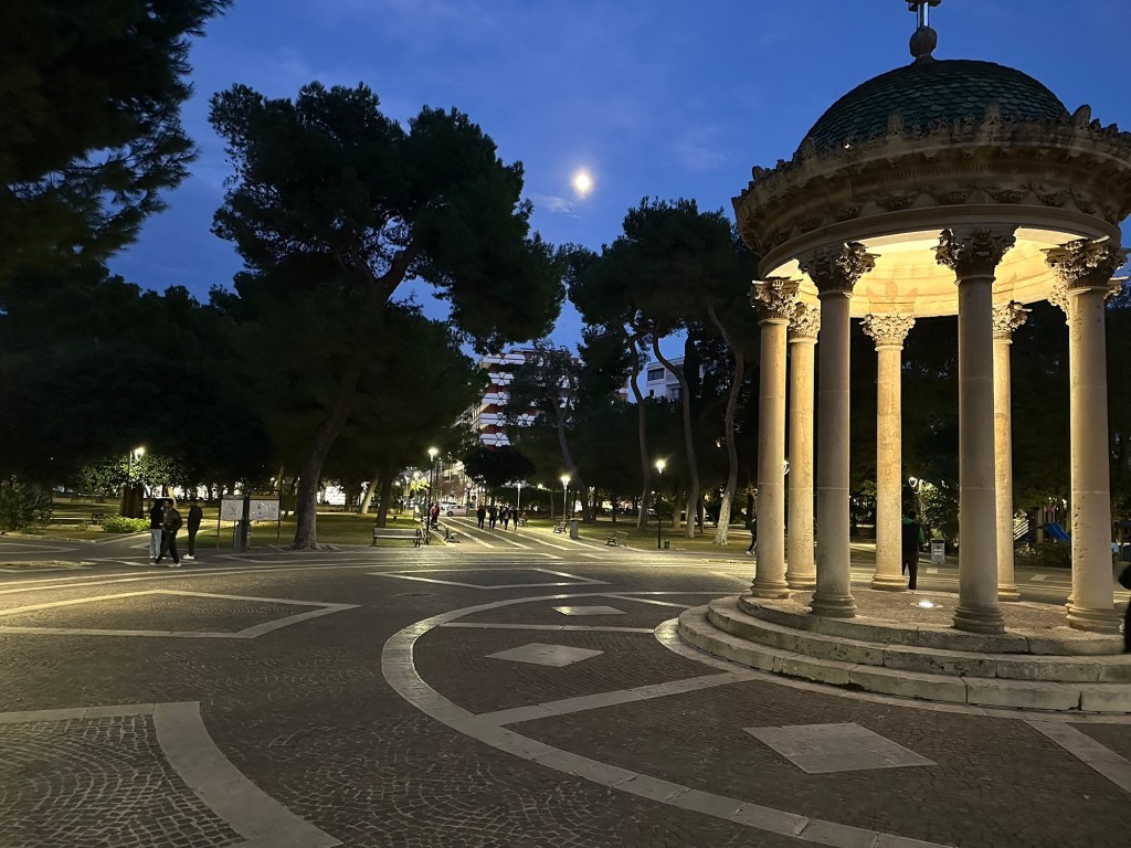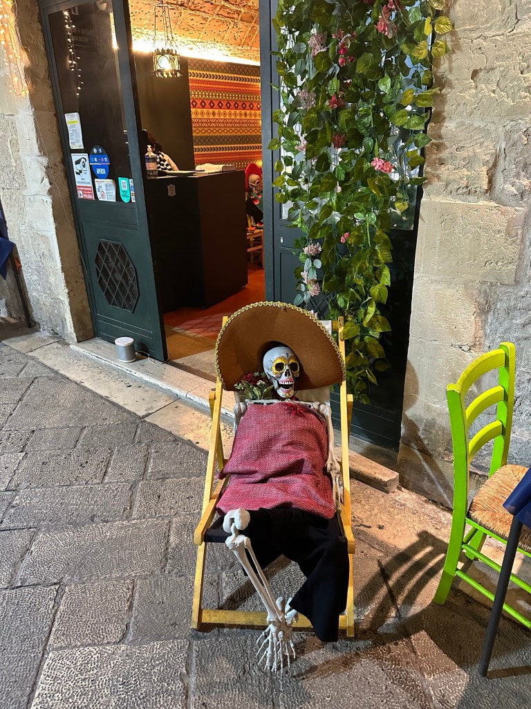 Martha and Doug left to go back to Spello, and I took off for the historic southern Puglia city of Lecce. Upon arrival, I found myself walking on a street with this accordionist playing a soundtrack. Lecce goes back thousands of years. This is a Roman gate to the city.Lecce is known for its Baroque architecture.All Italian cities have beautiful parks and fountains.Moon all but full.What’s this??A Mexican restaurant. Evidently still observing the Day of the Dead.Take a look at those knockers!Historic buildings in main piazza all lit up.