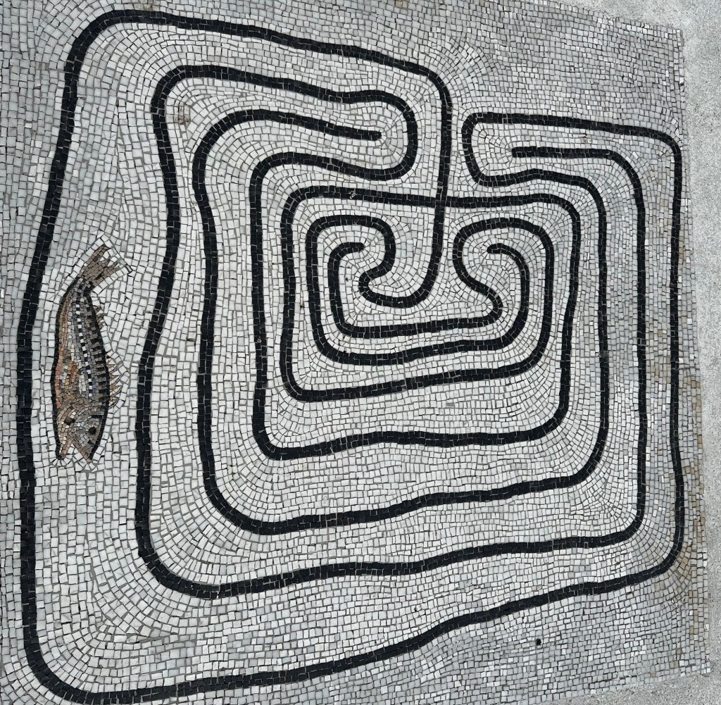 Mosaic fish maze in the sidewalk