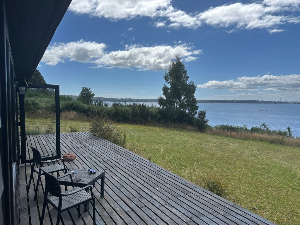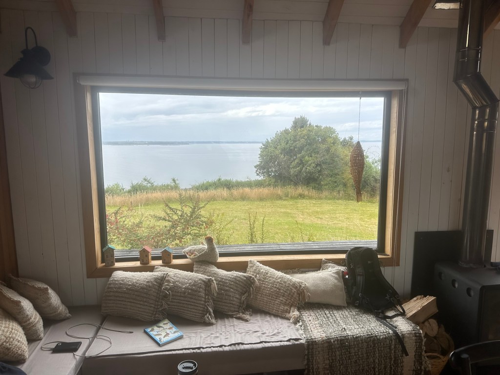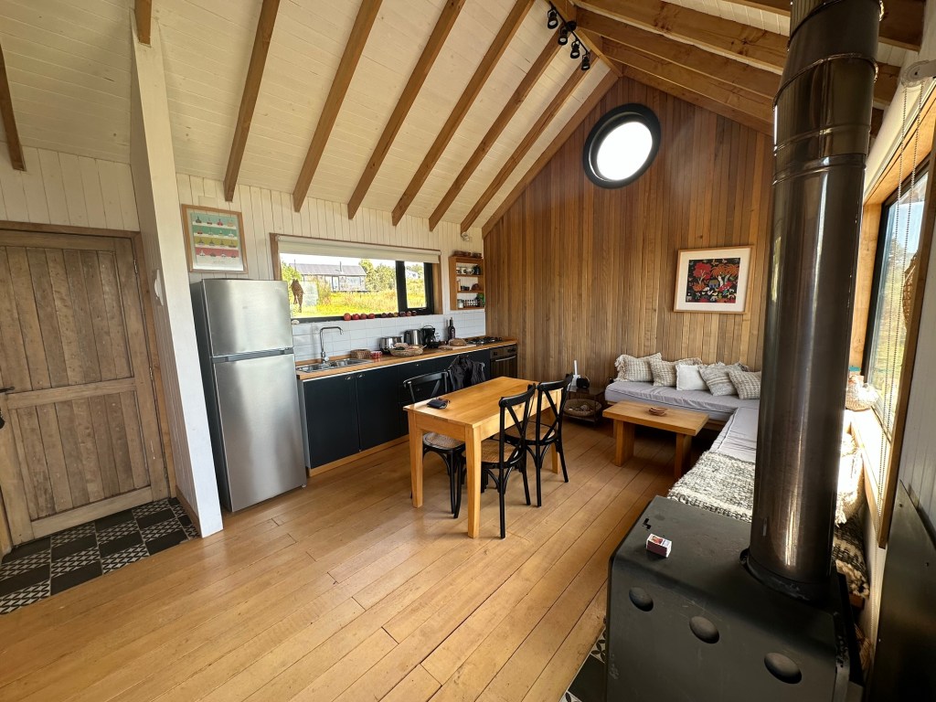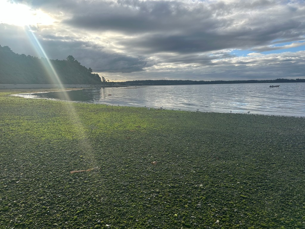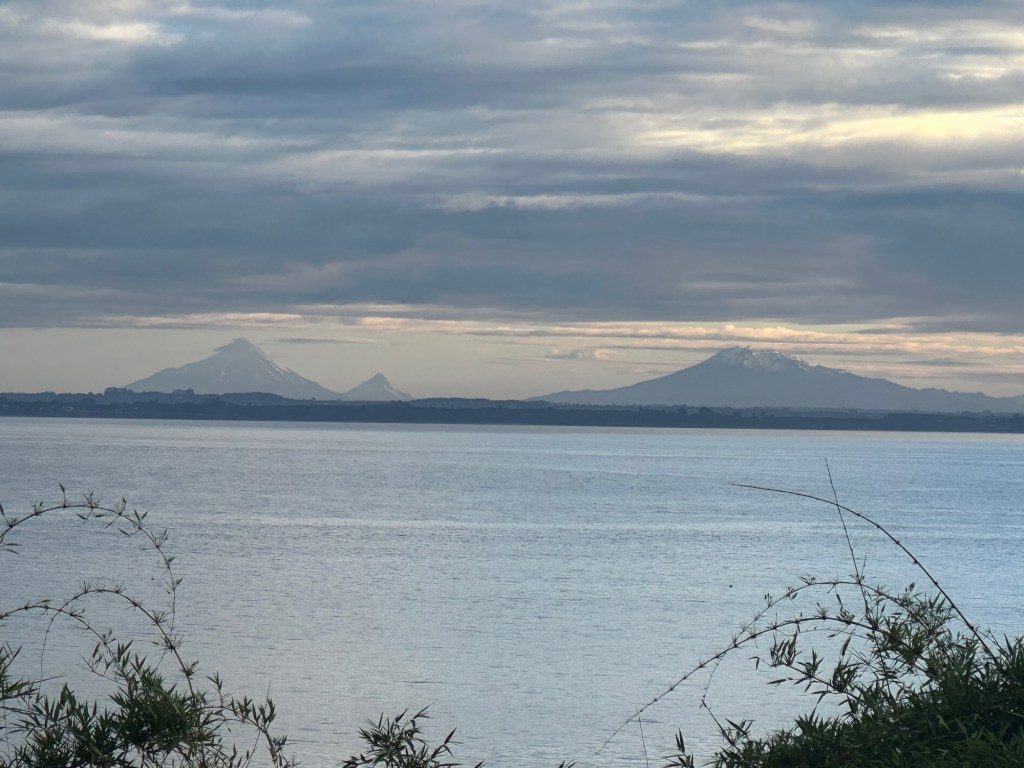 Arrived at our Chiloe cabin for the next few days. It is a classic Chilote (person from Chiloe) house…and it’s on the sea!Watching seals, dolphins, and seabirds.out the kitchen/living room window…3 volcanoes visible from the deckThere is a path down to the mossy waterfront from the cabaña, lined with ripe blackberries. Zoom in…at low tide the rocks are covered with fuzzy green moss.