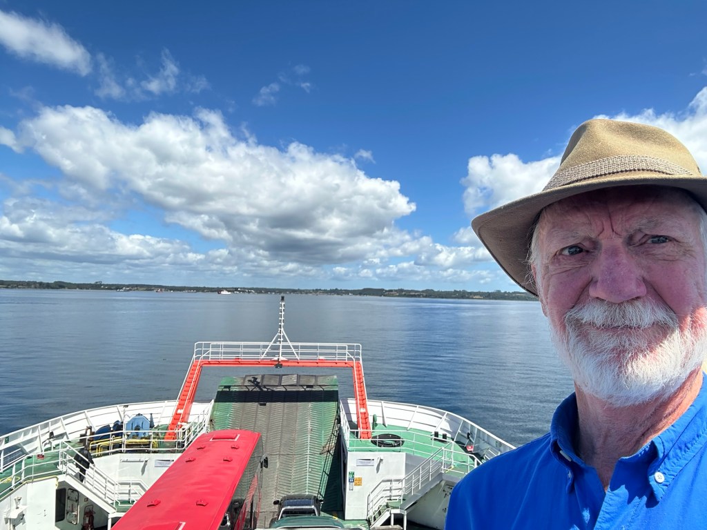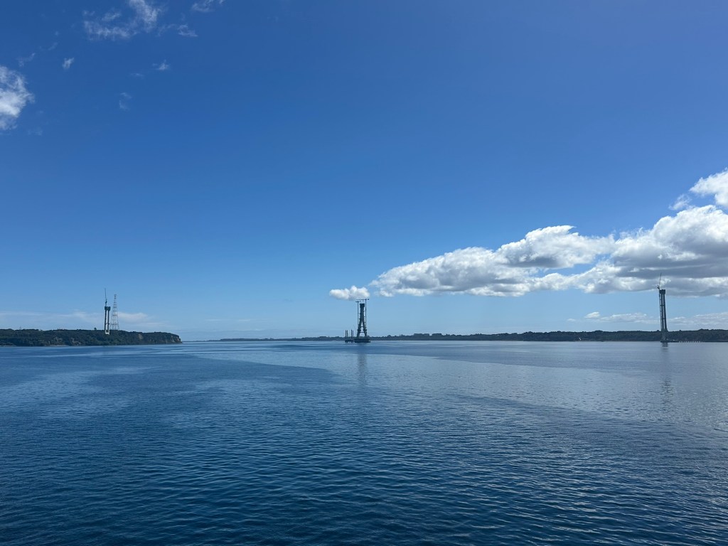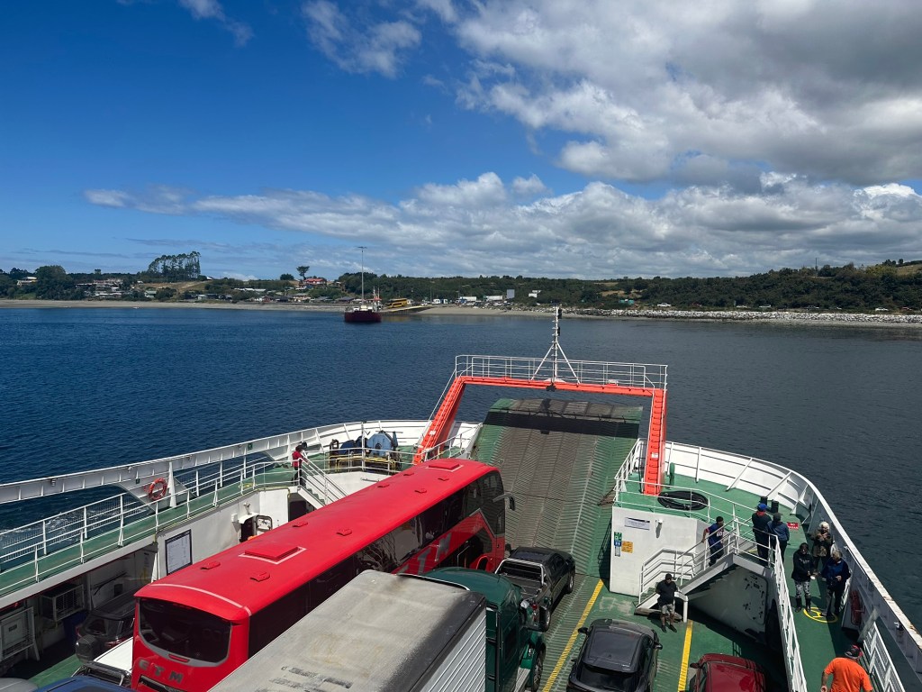 Selfie with car ferry. We are amped to spend time on Chiloé. For the next 2 weeks it’s going to be Chilotes and geezers.Room was given to the big rigs firstBuilding piers for a new suspension bridge connecting Chiloé with mainland Chile in 2028. Built to allow ocean vessels to clear. It may change Chiloé forever…