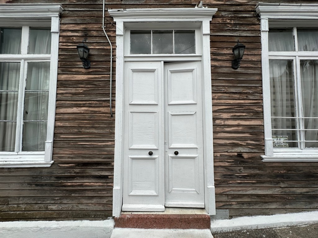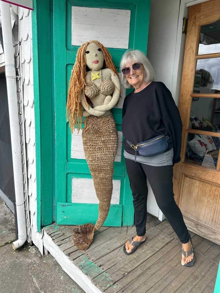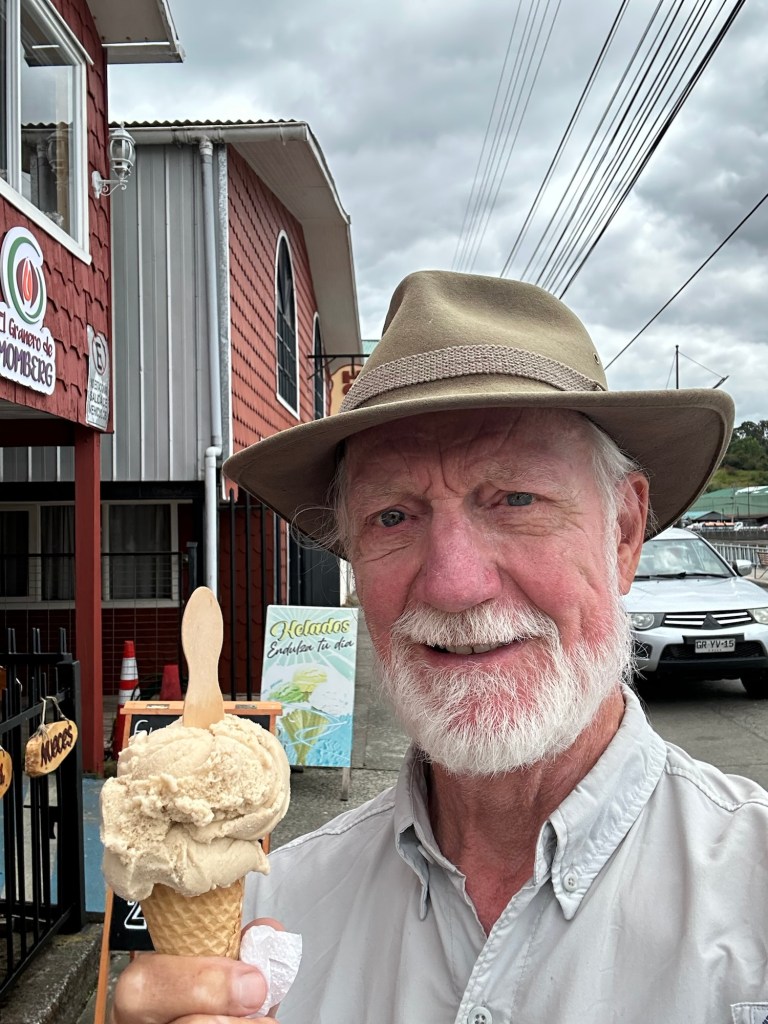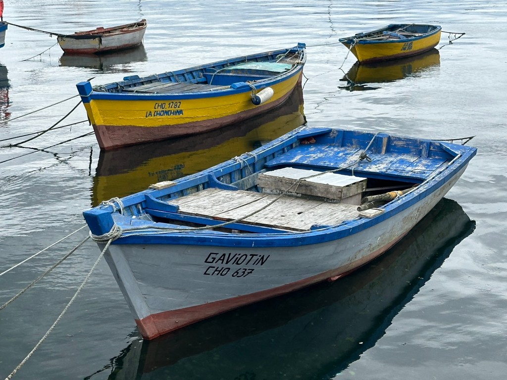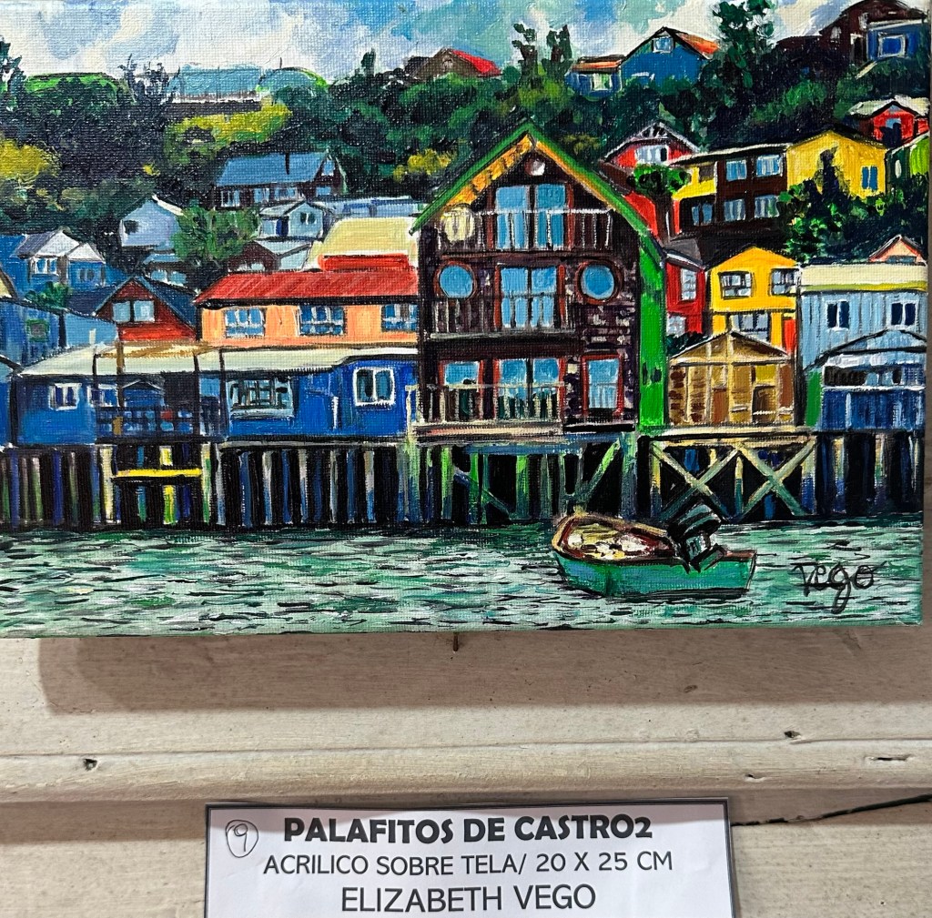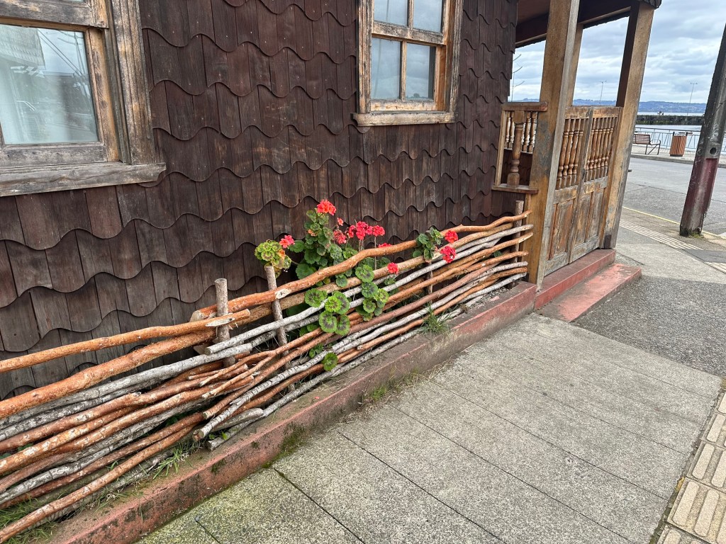 We stopped in Chonchi, Chiloé for supplies and fuel, and visited a museum showing local artists’ work. This one of palafitos (waterfront houses on stilts) in Castro caught my attention.Couldn’t pass up tiramisu ice cream. Always on the lookout for cool doors.Wooden boats n wooden buildings, many brightly painted.Looks like a little homemade boat.Woven stick fence with red geraniums Marianne with mermaid. She was impressed with its ta-tas.Flowers everywhere
