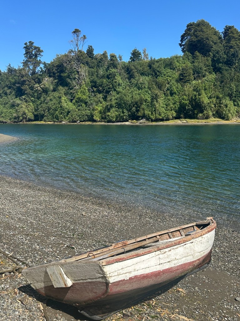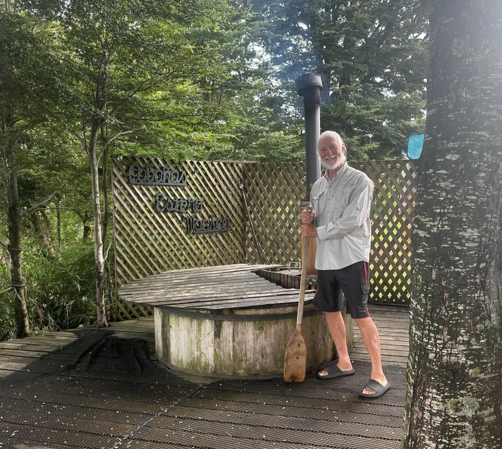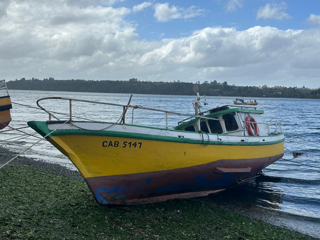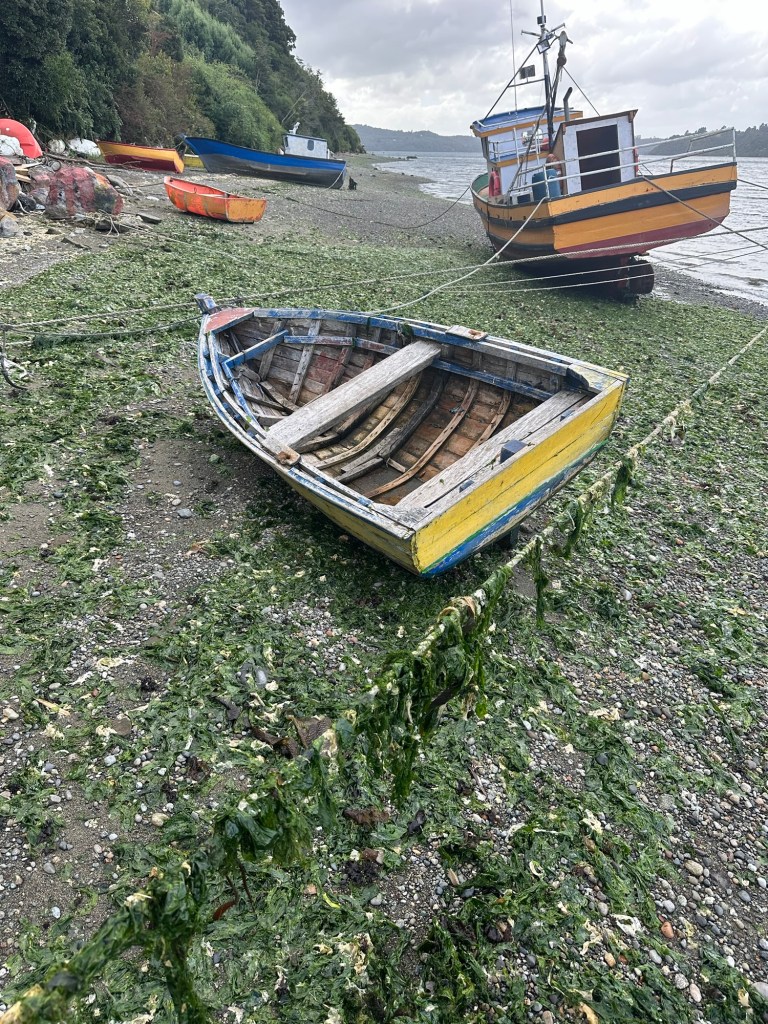 We stayed at an Airbnb that overlooked a good-sized arm of the sea and a smaller estuary. This is from our deck. Tides were over 6 meters (around 20 feet). This is high tide.Oh, and this is the view from our tinaja (wood fired hot tub).Carved wooden paddle for mixing up the heated water in the tinaja.Rain happened… then the sun would come out. Rinse and repeat. I enjoyed walking down the path to the beach and checking out all the tied up wooden boats at low tide.